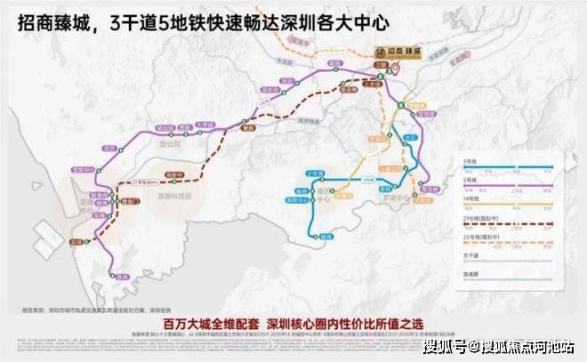招商臻城项目毗邻龙岗大道、水官高速、布龙路城市三大干道,坐享轨道交通3号线、5号线、14号线,近邻规划中的17号线、21号线及25号线,快速通达福田、南山、罗湖等中心区,尽享未来。