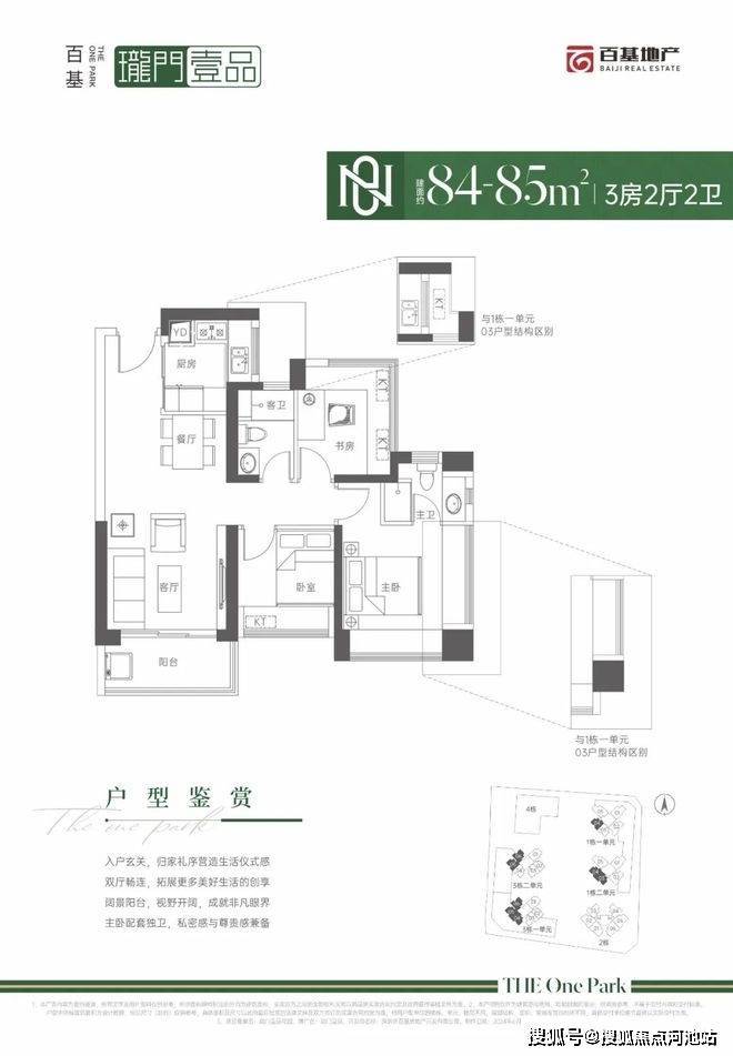 84㎡的3房2厅2卫,设计的是经典竖厅格局,进门入户玄关,客厅3.5米开间,LDKB一体化设计,动静分区,主卧+1个次卧270°飘窗,U型厨房,卫生间干湿分离,得房率:71.29%(不含赠送),西南或西北朝向。