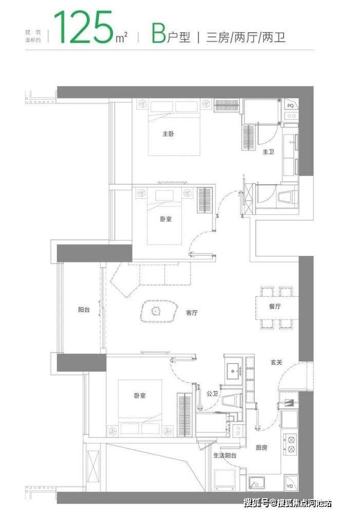 B户型建面约125㎡三房两厅两卫