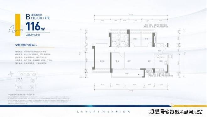 经典竖厅格局,次卧一和客厅连接约6米超长阳台;03/04户型东南朝向,01/02户型西南朝向。