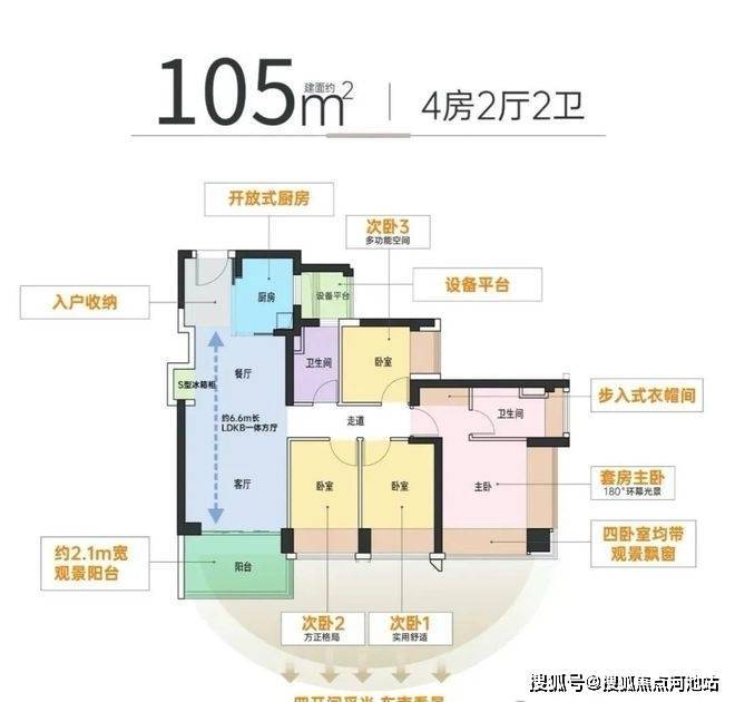 105㎡的4房2厅2卫:设计的是经典竖厅格局,客厅3.6米开间,四开间朝南,4个卧室分别做到了主卧17.59㎡/次卧9.5㎡/次卧8.93㎡/次卧7.75㎡(包含墙体飘窗),公卫带1个3.12㎡的设备平台,得房率约:100%(包含赠送),东南朝向看观澜河景观。