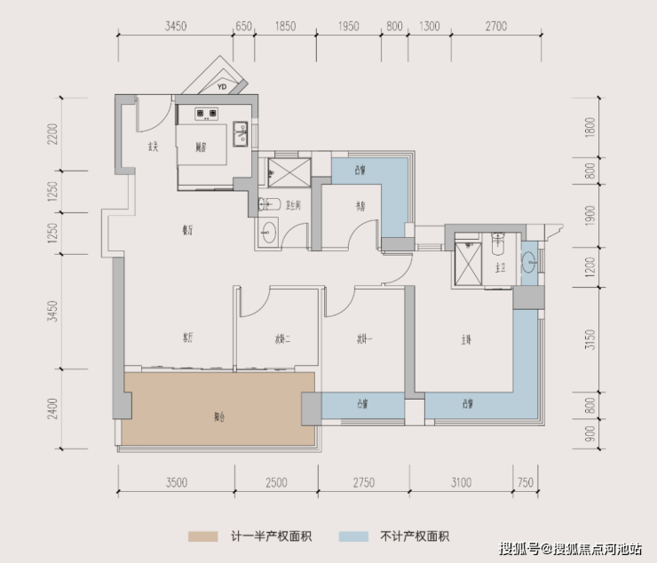 89㎡A户型,南北通透,客厅3.5米宽,五开间朝南,主卧双飘窗,可改四房,赠送面积约24.5㎡,得房率高达104.87%。