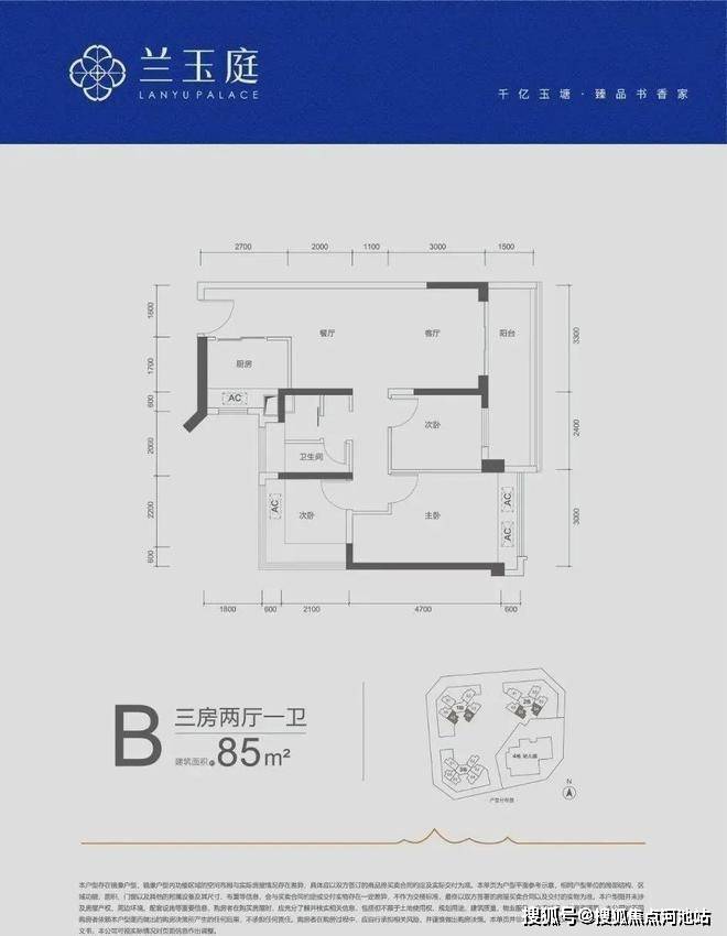 85㎡的3房2厅1卫,A户型,设计的是竖厅格局,客厅开间3.3米,LDKB一体化,三开间朝南,3个卧室分别做到了3米/2.8米/2.4米的宽度,客厅连接次卧出5.7米长的大阳台,L型厨房,得房率约79%(不含赠送),西南或东南朝向。