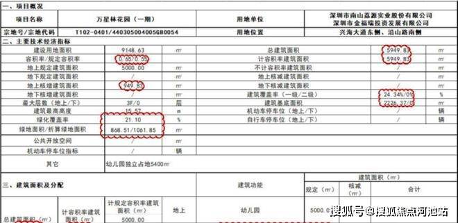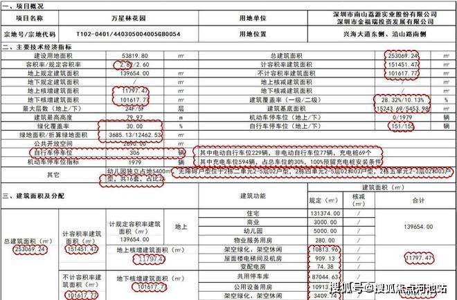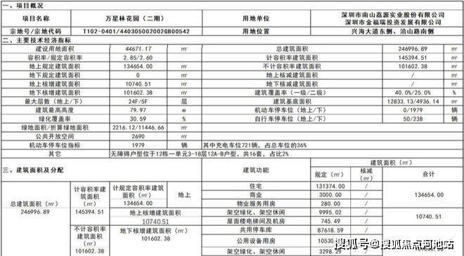 万星林花园项目宗地号T102-0401。根据本项目《深圳市国有建设用地使用权出让合同》及《建设用地规划许可证》,项目总用地面积53819.80平方米,用地性质为二类居住用地;计规定总建筑面积139654平方米,其中住宅131374平方米、商业3000平方米、幼儿园5000平方米(独立占地面积5400平方米,18班)、物业管理用房280平方米;规定容积率≤2.6;建筑一级覆盖率≤40%,二级覆盖率≤25%;建筑高度限高80米;机动车泊位数1979辆;地块内需提供不少于2690平方米公共开放空间。
