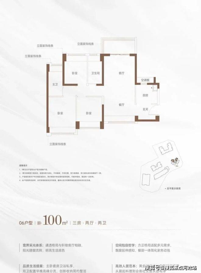 总规划1007户,其中可售商品房879套,全部3梯6户设计,停车位1000个(车位比1:0.99)。