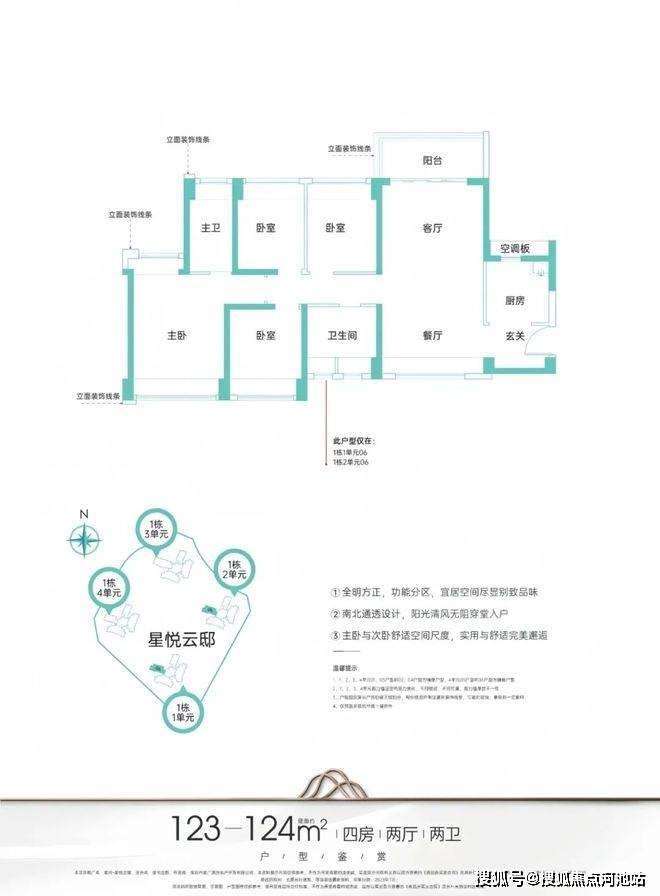 123㎡的4房2厅2卫,设计的竖厅南北通透格局,进门独立入户玄关,全屋飘窗设计,U型厨房,得房率:78.15%(不含赠送),阳台主朝东北向。
