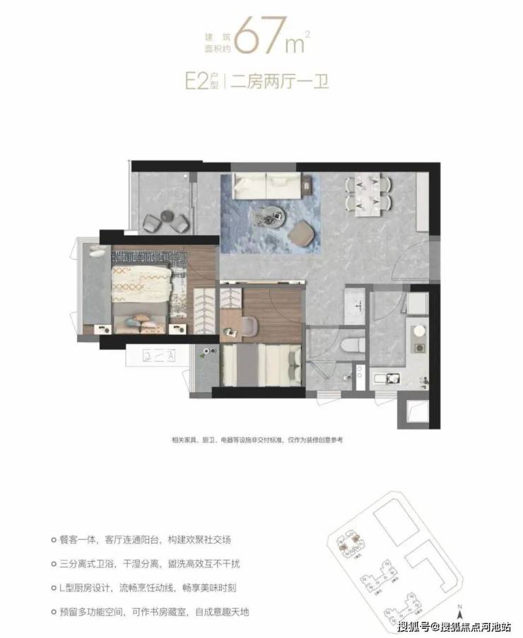 67㎡的2房2厅1卫(E2),设计的是竖厅格局,餐客一体,L型厨房,卫生间三段式分离设计,阳台预留多功能空间可以改小书房,西南或东北朝向。