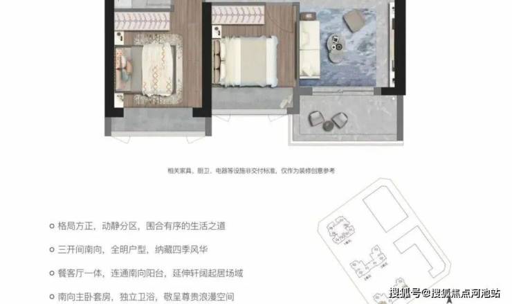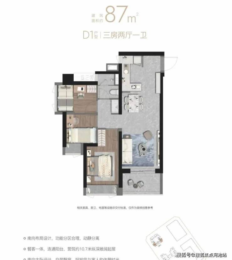 87㎡的3房2厅1卫( D1),设计的是竖厅格局,餐客一体,直通阳台,约10.7米纵深,南向主卧带飘窗,U型厨房,卫生间三段式分离设计,阳台东南朝向。