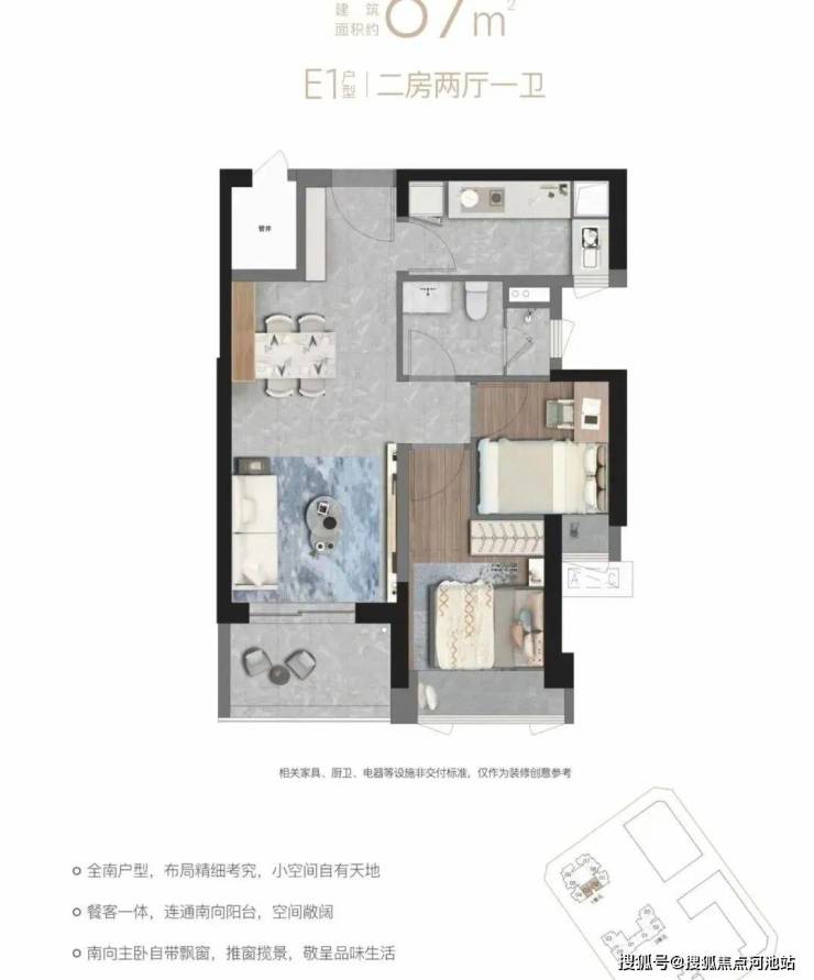 67㎡的2房2厅1卫(E1),设计的是竖厅格局,餐客一体,南向主卧带飘窗,L型厨房,阳台东南朝向。