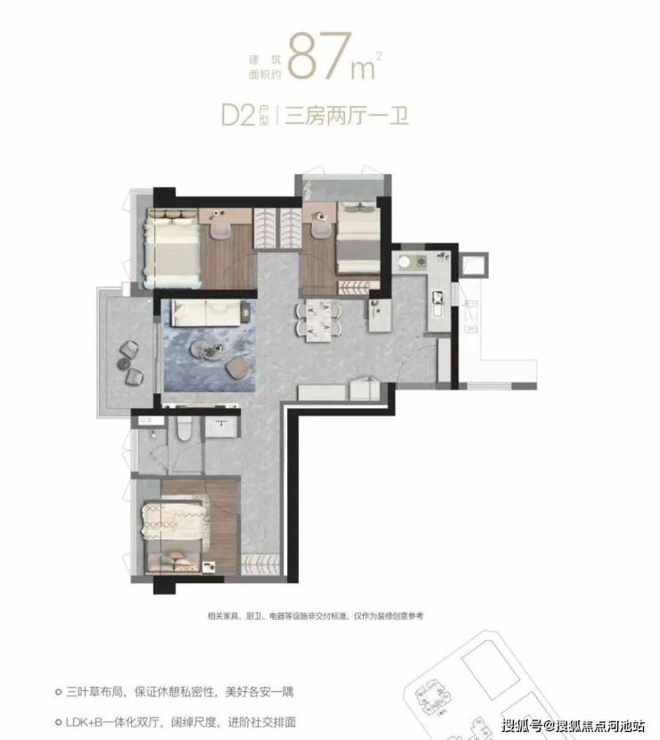 87㎡的3房2厅1卫(D2),设计的是竖厅三叶草格局,LDK+B一体化双厅,U型半开放式厨房,阳台西南、东北朝向。