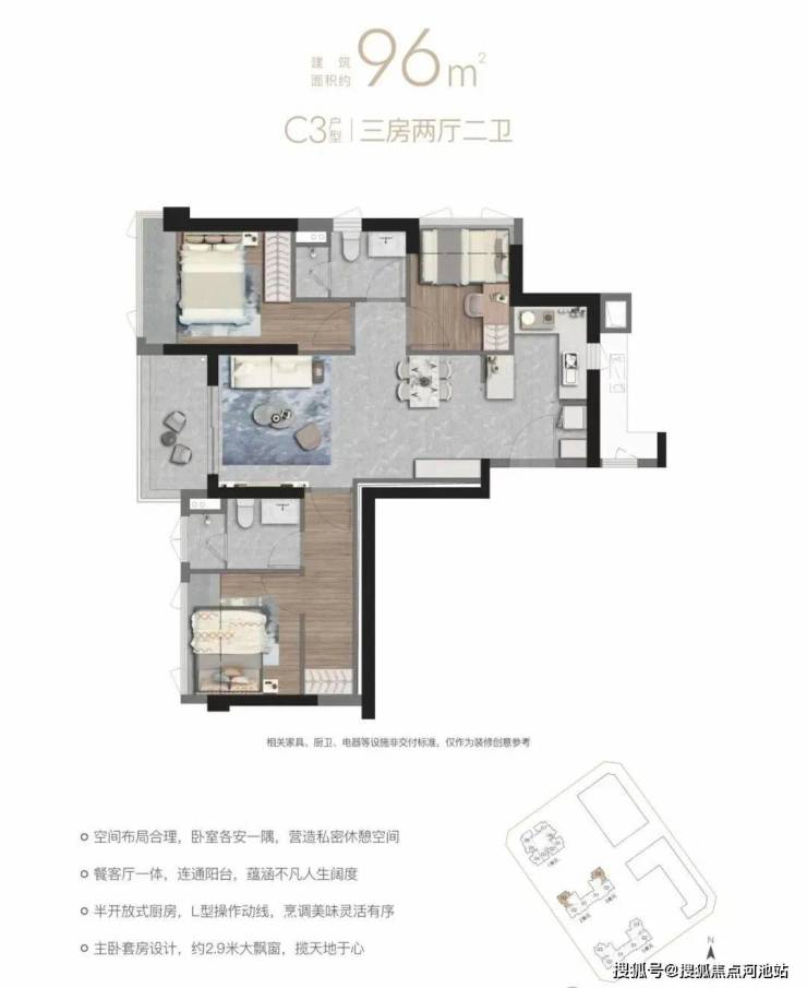 96㎡的3房2厅2卫(C2),设计的是竖厅经典格局,餐客厅一体化,三开间朝南,主卧套房设计,U型厨房,公卫三段式分离设计,阳台东南朝向。