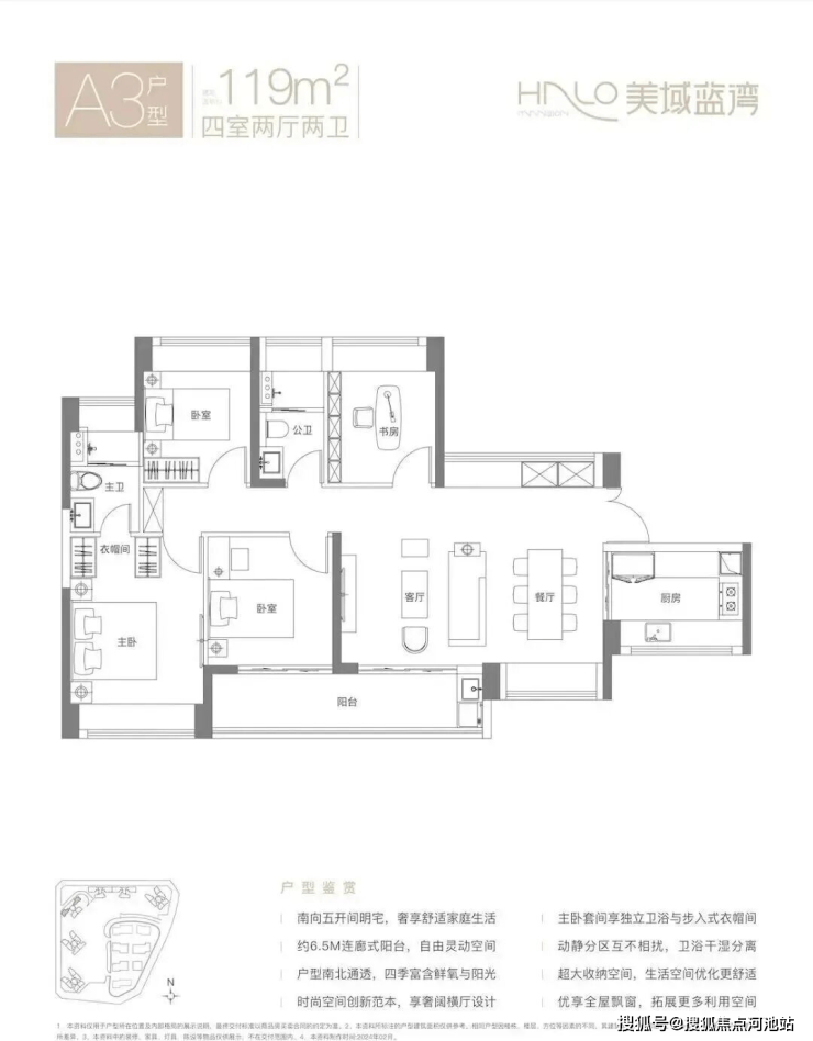 119㎡的4房2厅2卫,A3户型,横厅南北通透格局,客餐厅6.3米开间,LDKB一体化设计,五开间朝南,U型厨房,卫生间干湿分离,客厅连接次卧出6.5米长的观景大阳台约9.75m²,阳台主朝东南向,得房率约75.3%(不含赠送),加上赠送得房率90.48%。