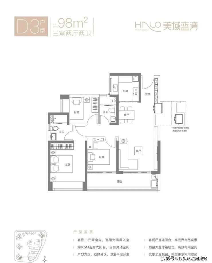 98㎡的3房2厅2卫,D3户型,经典竖厅格局,客厅3.7米开间,LDKB一体化设计,S墙设计预留冰箱卡槽位,动静分区,客厅连接次卧出6.5米长的大阳台,U型厨房,卫生间干湿分离,得房率约80.12%(不含赠送),东南朝向。