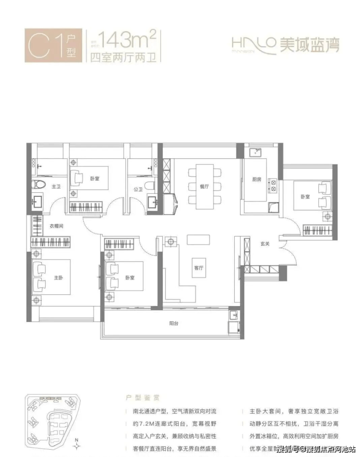 143㎡的4房2厅2卫,C1户型,竖厅南北通透格局,客厅4.2米开间,五开间朝南,客厅连接次卧出7.2米长的巨幕大阳台,U型厨房,卫生间干湿分离,得房率约77.13%(不含赠送),阳台主朝正南向。