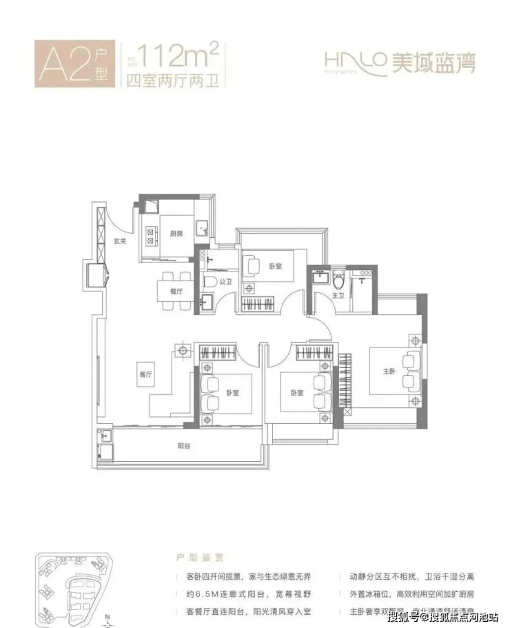 112㎡的4房2厅2卫,A2户型,竖厅南北通透格局,客厅3.9米开间,LDKB一体化设计,S墙设计预留冰箱卡槽位,动静分区,客厅连接次卧出6.5米长的大阳台,U型厨房,卫生间干湿分离,得房率约80.12%(不含赠送),西南或东北朝向。