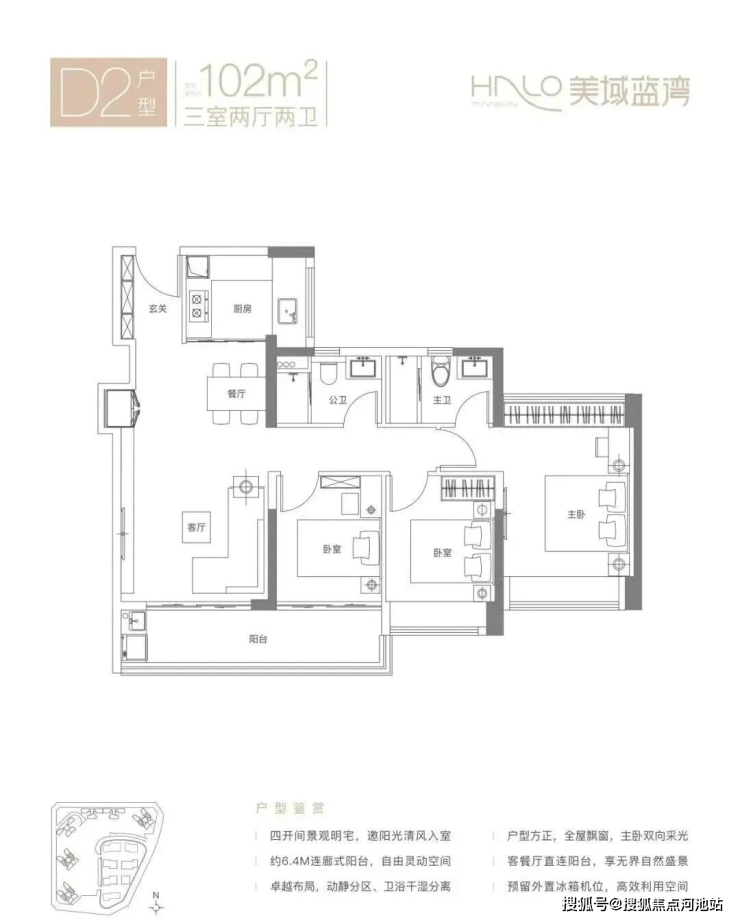 102㎡的3房2厅2卫,D4户型,经典竖厅格局,客厅3.7米开间,LDKB一体化设计,S墙设计预留冰箱卡槽位,U型厨房,卫生间干湿分离,三开间朝南,客厅连接次卧出6.4米长的观景大阳台约9.75m²,东南朝向看小区园林,得房率约75.3%(不含赠送),加上赠送得房率83.97%。