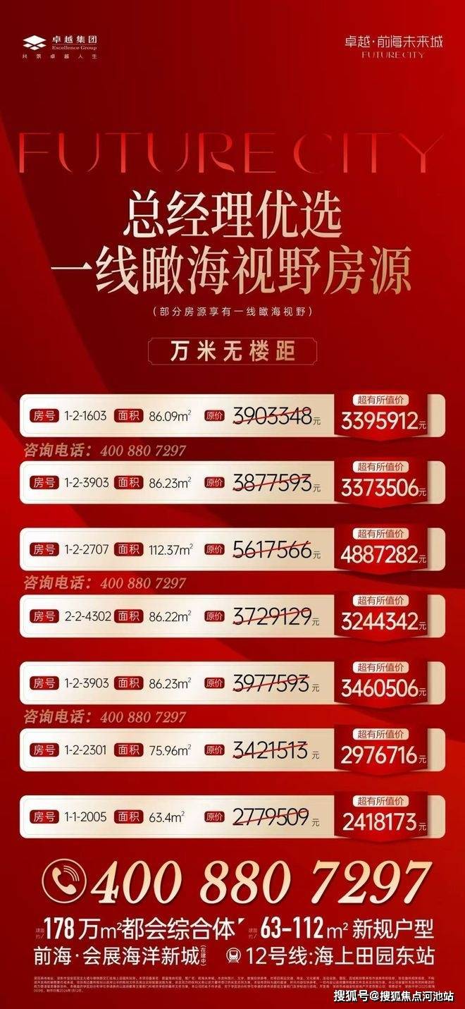 最新消息:卓越前海未来城加推1栋1单元,面积63-112㎡,已拿证!备案均价约4.5万/㎡,开盘约87折。折后均价约3.9万/平,折后单价3.65万-4.55万!63平折后总价238万起!