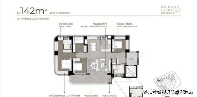 142m²四房两厅两卫的A户型:双龙抱珠户型,得房率约92-100%(含赠送),朝向为西南或东南。