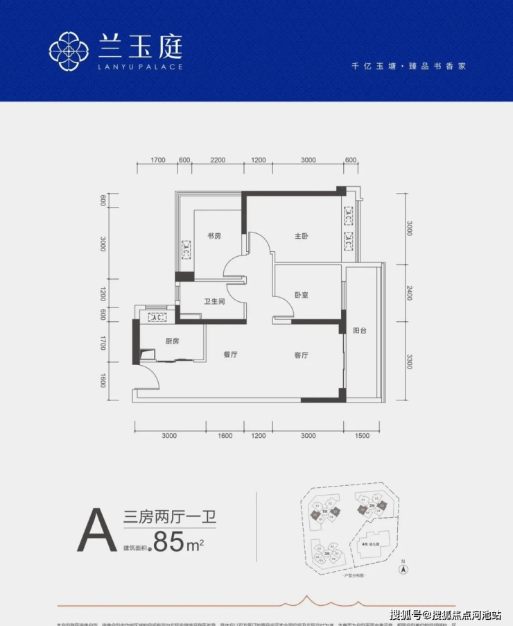 85㎡的3房2厅1卫,A户型,设计的是竖厅格局,客厅开间3.3米,LDKB一体化,三开间朝南,3个卧室分别做到了3米/2.8米/2.4米的宽度,客厅连接次卧出5.7米长的大阳台,L型厨房,得房率约79%(不含赠送),西南或东南朝向。