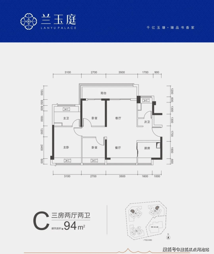 94㎡的3房2厅2卫,C户型,设计的是竖厅南北通透格局,客厅开间3.5米,3个卧室分别做到了3.1米/2.7米/2.7米的宽度,客厅连接次卧出6.2米长的大阳台,U型厨房,公卫三段式分离,得房率约79%(不含赠送),阳台主朝西北或东北向。