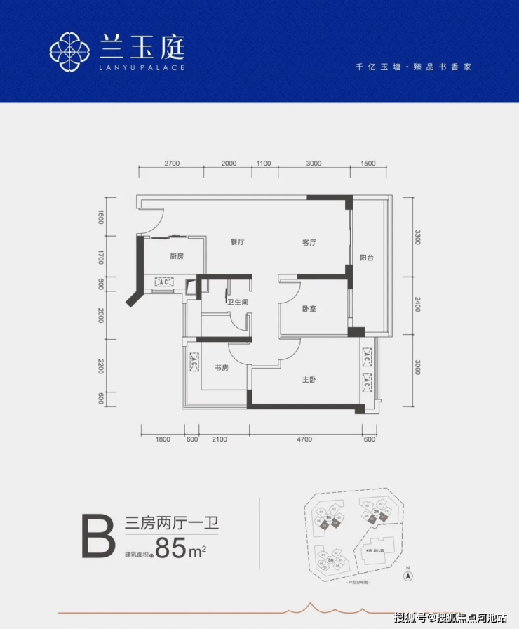85㎡的3房2厅1卫,B户型,设计的是竖厅格局,客厅开间3.3米,LDKB一体化,三开间朝南,3个卧室分别做到了3米/2.7米/2.4米的宽度,客厅连接次卧出5.7米长的大阳台,L型厨房,创新式三分离卫生间,得房率约79%(不含赠送),西南或东南朝向。