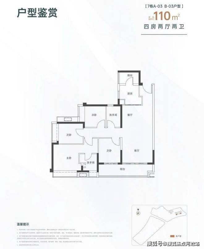 110㎡的4房2厅2卫,设计的是经典竖厅格局,进门入户玄关,LDKB一体化设计,四开间朝南,动静分区,客厅连接次卧出大阳台,L型厨房还带1个生活阳台,卫生间干湿分离,得房率约82%(不含赠送),东南朝向。