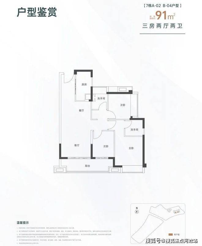 91㎡的3房2厅2卫,设计的是经典竖厅格局,进门入户玄关,LDKB一体化设计,三开间朝南,动静分区,客厅连接次卧出大阳台,L型厨房,公卫三段式分离,得房率约82%(不含赠送),东南朝向。
