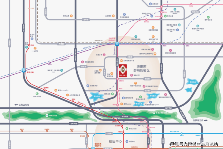 项目南侧约1.4公里(2站地铁)可达星河COCO PARK,这是深圳最具时尚气质的文创主题购物中心,拥有乐活永辉超市、悦享寰宇影城等主力店,2024年新增星空广场、莱特飞行者深圳首店、苹果授权店等业态。此外,距离天虹商场坂田店约1.8公里,周边还有阳光湾畔等小型商业设施。整体来看,项目商业配套覆盖全面,从日常便利到高端消费均有满足,且多为步行或短途地铁可达,极大提升了生活便利性。