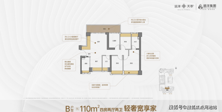 110㎡的4房2厅2卫,设计的是竖厅南北通透格局,客厅4.2米开间,进门户玄关,客厅连接次卧出6.5米长的大阳台,主卧大套间设计,全屋9处飘窗,4个卧室分别做到了主卧13.1㎡/次卧8.03㎡/次卧6.48㎡/次卧6.14㎡(实测面积,去掉墙体),U型厨房,卫生间干湿分离,得房率约72.52-72.57%(不含赠送),阳台主朝北向。套内面积80.06㎡+赠送面积13.31㎡=实得93.38㎡,加上赠送后得房率约84.64%。
