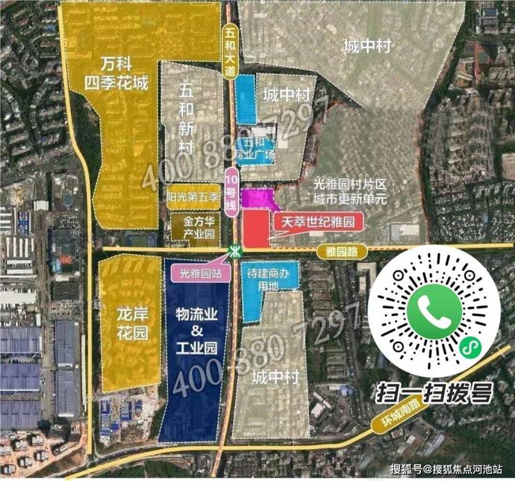 远洋天萃世纪雅园,位于龙岗区坂田街道五和社区,紧邻地铁10号线光雅园站B出口,地处华为全球总部基地所在的坂雪岗科技城核心区域。坂田街道是深圳GDP排名第二的街道,2022年GDP高达2252亿元,占龙岗全区的66%,经济实力雄厚。该片区重点发展现代通信技术、新型显示、云计算、下一代互联网等高新技术产业,是深圳都市核心区和广深港澳科技创新走廊的重要组成部分。项目处于深圳几何中心位置,罗湖、龙岗、龙华三区交界处,区位优越,既享受产业发展的红利,又具备便捷的通勤条件。