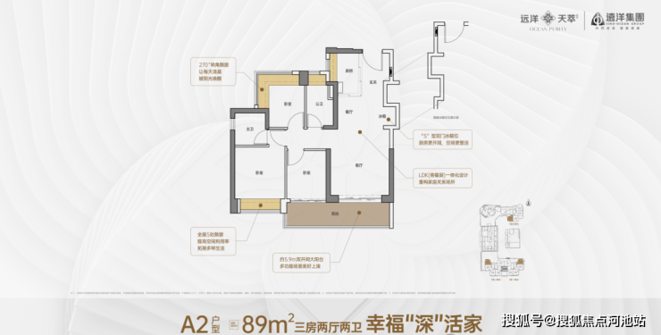 89㎡的3房2厅2卫,A2户型,设计的是竖厅格局,客厅3.5米开间,LDKB一体化,S墙设计预留冰箱卡槽位,动静分区,次卧270度转角飘窗,3个卧室分别做到了主卧12.54㎡/次卧7.24㎡/次卧6.08㎡(实测面积,去掉墙体),客厅连接次卧出5.9米长的大阳台,U型厨房,卫生间干湿分离,得房率约72.16-72.57%(不含赠送),正西向、正东向或正南向。套内面积64.89㎡+赠送面积10.68㎡=实得75.57㎡,加上赠送后得房率约84.53%。
