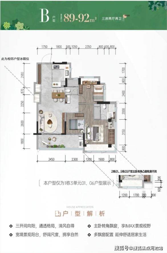 92㎡三房二卫(横厅):440-493万 ,拓展后实际使用率约102%-105%;