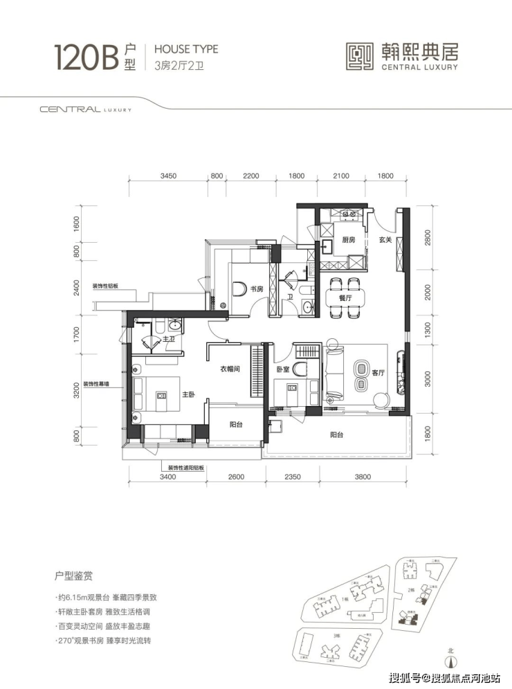 120B户型3房2厅2卫,是双阳台设计的竖厅格局,两个阳台总面宽超过12米,朝南景观视野极佳。