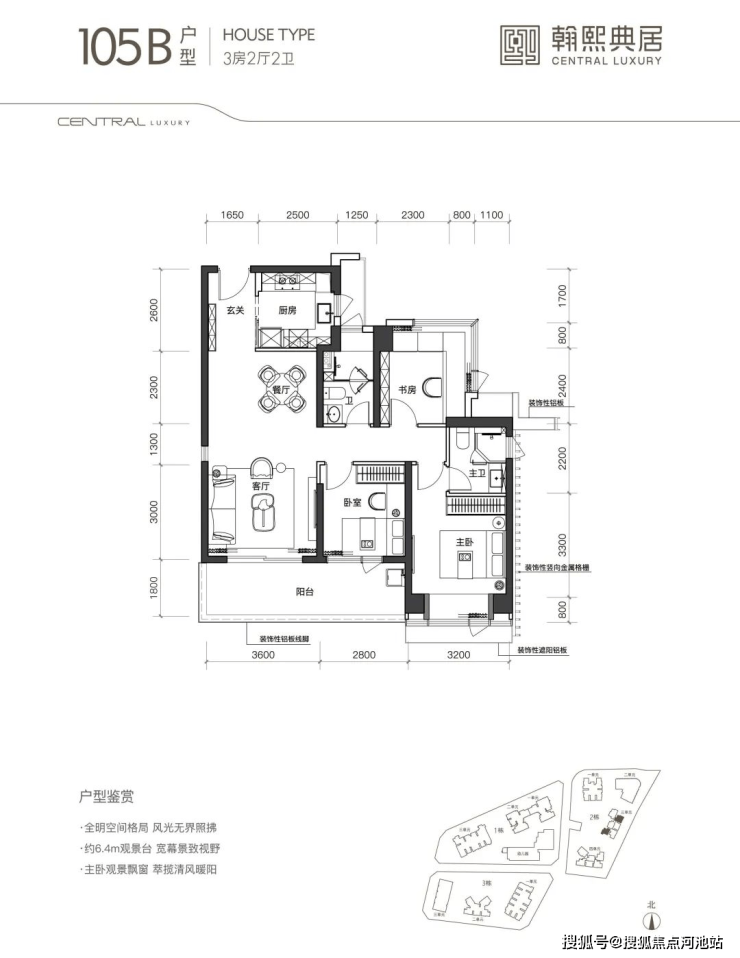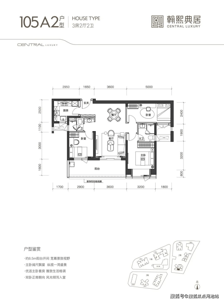 105A1户型3房2厅2卫,经典的双龙抱珠格局,约23㎡阔气通厅分隔主卧与客卧,私密度较高。