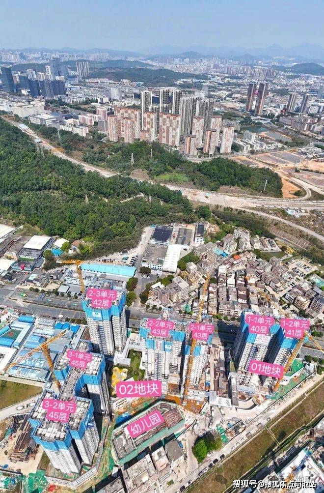 02地块:总占地面积约1.77万㎡,总建筑面积约19.67万㎡,计容建筑面积约13.71万㎡,容积率7.3,绿化率30%,共由5栋42-45层高住宅组成,其中2栋1/2单元住宅43F,2栋3单元住宅42F,3栋1/2单元住宅45F,4栋是1所9班制幼儿园。