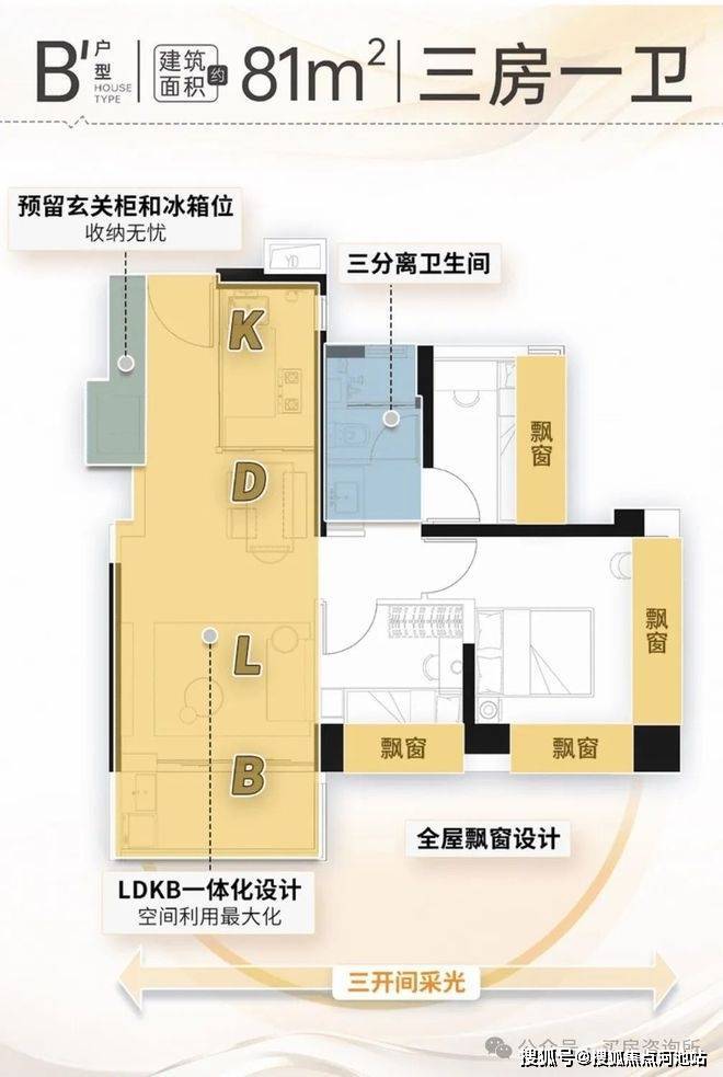 建面约81㎡三房一卫,有两个户型,都是竖厅设计。