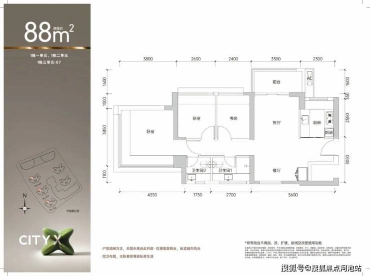 88㎡的3房2厅2卫,设计的是竖厅南北通透格局,客厅3.3米开间,LDKB一体化设计,四开间朝南,主卧270°无转角飘窗,3个卧室分别做到了主卧15.63㎡/次卧7.54㎡/次卧6.96㎡(包含墙体飘窗),U型厨房,卫生间干湿分离,得房率约90%(包含赠送),阳台主朝西北或东北向。