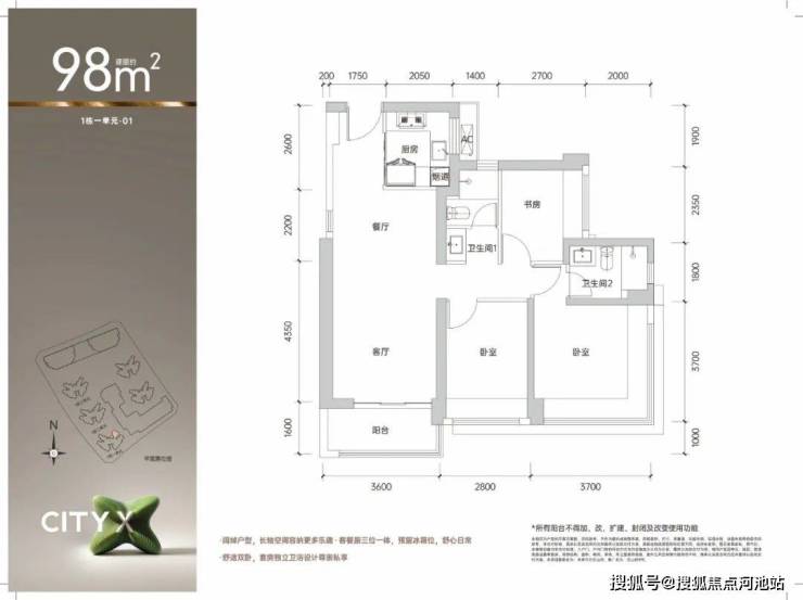 98㎡的3房2厅2卫,1栋1单元01户型,设计的是经典竖厅格局,进门入户玄关,客厅3.6米开间,LDKB一体化设计,动静分区,3个卧室分别做到了主卧14.3㎡/次卧10.36㎡/次卧6.75㎡(包含墙体飘窗),U型厨房,公卫三段式分离,得房率约90%(包含赠送),东北朝向。
