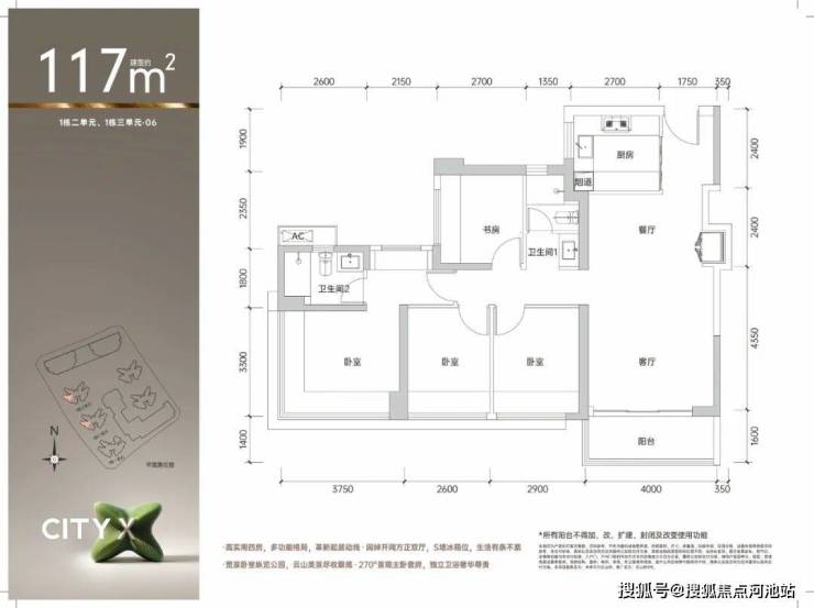 117㎡的4房2厅2卫,1栋2/3单元06户型,设计的是经典竖厅格局,进门入户玄关,客厅4米开间,LDKB一体化,S墙设计预留冰箱卡槽位,四开间朝南,动静分区,4个卧室分别做到了主卧16.5㎡/次卧9.57㎡/次卧8.58㎡/次卧7.97㎡(包含墙体飘窗),U型厨房,公卫三段式分离,得房率约90%(包含赠送),东南或西南朝向。