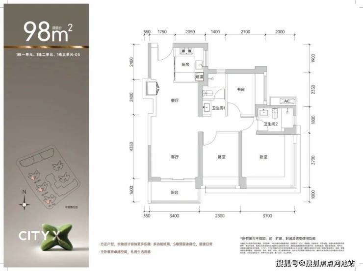 98㎡的3房2厅2卫,1栋1/2/3单元03.05户型,设计的是经典竖厅格局,进门入户玄关,客厅3.4米开间,LDKB一体化,S墙设计预留冰箱卡槽位,三开间朝南,动静分区,3个卧室分别做到了主卧14.3㎡/次卧10.36㎡/次卧6.75㎡(包含墙体飘窗),U型厨房,公卫三段式分离,得房率约90%(包含赠送),东南或西南朝向。