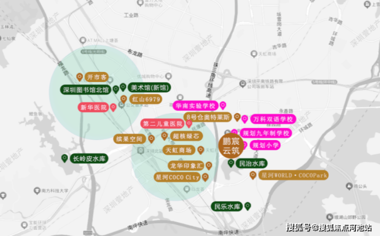 商业:自带3500㎡商业,底商不够丰富,周边1公里内有8号仓奥特莱斯购物中心,1.5公里范围分布有民治天虹购物中心、星河COCO PARK、星河COCO CITY等多个购物商场。