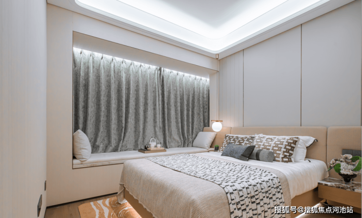 主卧双面飘窗,采光通透,尺度也比较阔绰。北向飘窗可以利用起来放置衣柜,2.9米开间,最大可容纳6门衣柜,再多的衣服也放得下。