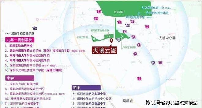 振业天境云庭,位于深圳光明中心区核心腹地,华夏路与周家大道交汇处,紧邻华夏中学,坐拥科学公园绿轴景观。项目所在区域原为工业用地,经规划调整后转型为低密度居住区,容积率仅3.1,远低于周边竞品。北侧为东周文化公园、国防教育主题公园及木墩村公园,东侧紧邻东周小学等优质教育资源,西侧与南侧为待开发空地,保证了开阔的景观视野和低密度居住体验。项目处于光明科学城规划的"产业转化区"与"生活服务中心"交汇处,直接受益于科学城人才导入和区域价值提升。