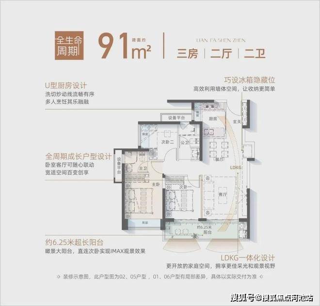 91㎡户型拥享约6.25米南向超长阳台,创变LDKG一体化设计,满足青年家庭成长需求。
