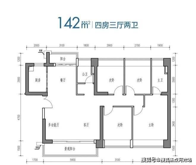 142m²4房2厅2卫设计的是横厅南北通透格局,进门入户玄关,客厅5.9米开间,餐厨一体化设计,南北双阳台,全屋6个飘窗面,4个卧室分别做到了主卧18.31㎡/次卧12.4㎡/次卧10.15㎡/次卧9.45㎡(包含墙体飘窗),客厅出5.9米长的观景大阳台,U型厨房,公卫三段式分离,得房率约87.1%(包含赠送),阳台主朝东南向。