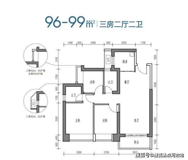 96-99㎡的3房2厅2卫,设计的是经典竖厅格局,客厅3.5米开间,LDKB一体化设计,动静分区,3个卧室分别做到了主卧14.63㎡/次卧11.07㎡/次卧7.26㎡(包含墙体飘窗),U型厨房,卫生间干湿分离,得房率约81-84%(包含赠送),东南/西南或东北朝向。