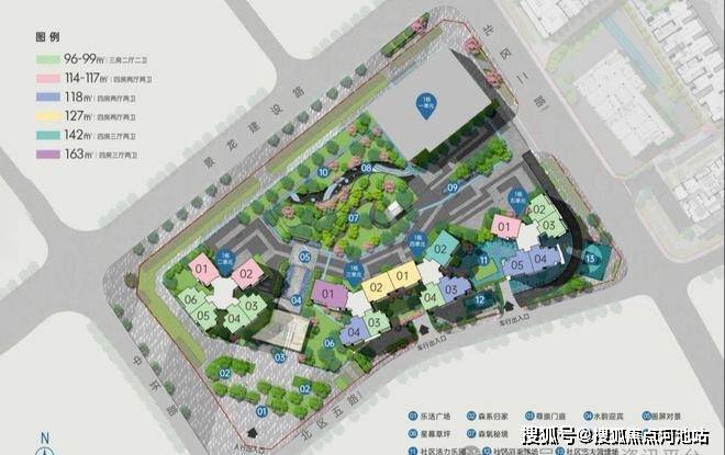 01-02地块,总占地面积约1.23万㎡,总建筑面积约15.08万㎡,计容建筑面积约10.85万㎡,容积率8.31,绿化率40.01%,共由2栋41-59F高的住宅组成,其中3栋住宅41F,4栋公共租赁住房59F,5栋办公楼30F,2栋是1所9班制幼儿园。