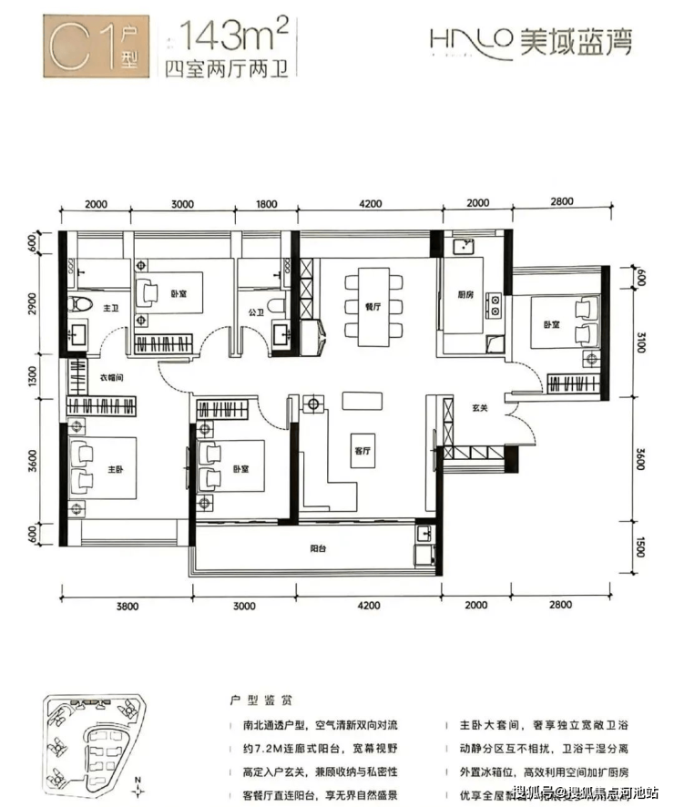 144㎡的4房2厅2卫,设计有2个户型,1个是类似于双龙抱珠的格局,正南朝向,1个是南北通透格局,得房率:77.03-77.13%(不含赠送),位于楼王单位,俯视小区全景。