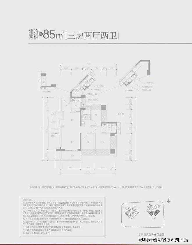 -85㎡的3房2厅2卫,设计的经典竖厅格局,客厅3.4米开间,LDKB一体化设计,S墙设计预留冰箱卡槽位,3个卧室分别做到了3.55米/2.6米/2.4米的宽度,U型厨房,公卫三段式分离设计,得房率约:95%(包含赠送),阳台进深1.8米,有西南或东南朝向。