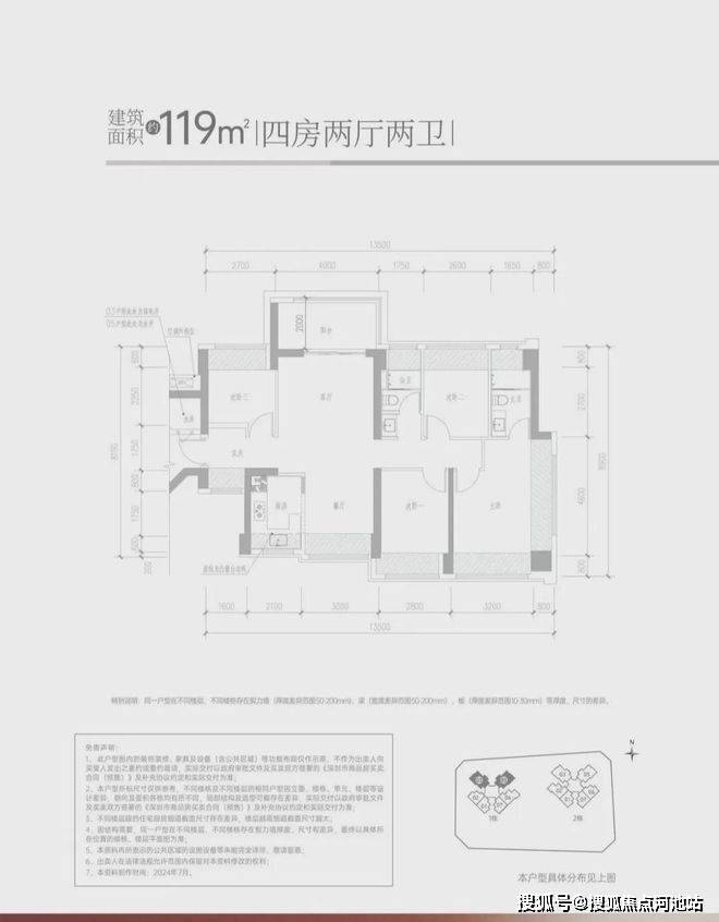 -119㎡的4房2厅2卫,设计的竖厅南北通透格局,客厅4米开间,进门独立玄关,4个卧室分别做到了4米/2.8米/2.7米/2.6米的宽度,U型厨房,公卫三段式分离设计,得房率约:95%(包含赠送),阳台主朝西北或东北向,看科学公园景观。
